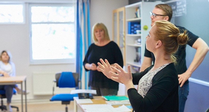 Allmän kurs för personer med hörselnedsättning och intellektuell funktionsnedsättning Allmän kurs för personer med hörselnedsättning och intellektuell funktionsnedsättning Allmän kurs IF är en allmän kurs speciellt utformad för deltagare som gått på anpassad grundskola eller gymnasieskola och vill ha undervisning på svenskt teckenspråk. Har du en intellektuell funktionsnedsättning och vill fördjupa din utbildning på teckenspråk och samtidigt utveckla din identitet? Då är denna kurs perfekt för dig! Kurslängd: 1 - 3 år Målgrupp: Teckenspråkiga döva och hörselskadade med intellektuell funktionsnedsättning Plats: Stockholms filial Ansökan: Löpande antagning Läs mer